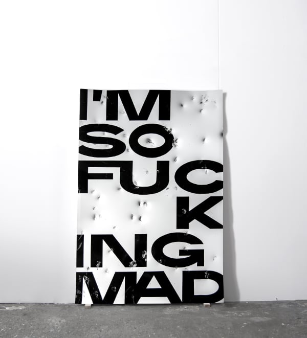 So lauten die ersten Zeilen des Songs „I’m so Fucking Mad“ der New Yorker Indie-Rockband Nightmare of You von 2014. Es scheint, als habe die Künstlerin Tanja Oppel die Grundstimmung dieses Liedes direkt ins Medium der dreidimensionalen Kunst übertragen. Malträtiert wird in „Violent Frustration“ aber kein menschlicher Boxsack, sondern eine 1,70 Meter hohe (und damit durchschnittliche Körpergröße eines Erwachsenen besitzende) Aludibond. Die weiße, mit großen schwarzen Lettern beschriftete Aluverbundplatte wurde ganz offensichtlich mit dem daneben lehnenden schwarzen Baseballschläger massiv traktiert. Dessen Spuren, die sich als Dellen im Material abzeichnen, erinnern zudem auf subtile Weise an die Einschusslöcher von Hausfassaden in Kriegsgebieten und damit an jegliche Formen von Gewalt, die Menschen einander anzutun vermögen.