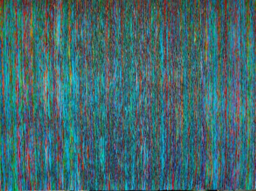 Sind in „blau rot grün“ alle Papierstreifen in ihrer jeweiligen Farbe identisch, so entsteht doch die optische Täuschung von helleren, dunkleren, matteren und strahlenderen Farbnuancen. Selbst Farbwechsel von Rot zu Violett werden durch die projektierte Anordnung der Komplementärfarben erzielt.