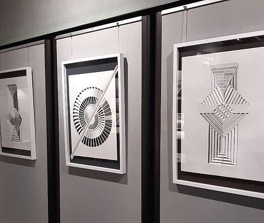 Unser Vereinsmitglied Michael Borgelt reduziert den Stein mittels feiner Linien und klaren Formen auf das Wesentliche, während Reinhard Schuster Papier als Relief schneidet, das durch Licht und Schatten lebt. Die gezeigten Werke sind sehr sorgfältig herausgearbeitet und überzeugen durch ihre Klarheit und Schlichtheit.